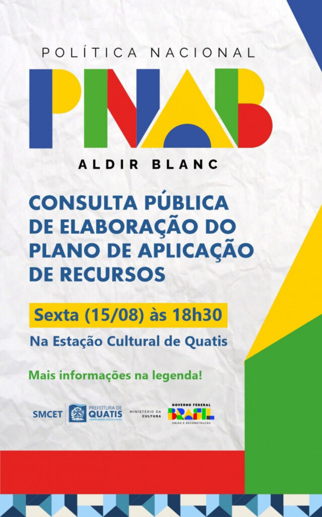 A Prefeitura de Quatis convoca artistas, produtores culturais e instituições da cidade para uma consulta pública decisiva sobre o futuro do financiamento à cultura local. O encontro, marcado para o dia 15 de agosto, visa definir como os recursos da Política Nacional Aldir Blanc de Fomento à Cultura (PNAB) serão aplicados no município em 2025. A reunião será realizada na Estação Cultural de Quatis, no bairro São Benedito, a partir das 18h30. O objetivo principal é garantir que a comunidade cultural participe ativamente na elaboração do Plano de Aplicação de Recursos (PAR), que guiará a distribuição das verbas federais. “A participação popular é fundamental para definirmos as diretrizes e prioridades que melhor atendam às necessidades da nossa cena cultural”, enfatiza a administração municipal em comunicado. A consulta pública oferece uma oportunidade única para os agentes culturais da cidade moldarem o futuro do setor. A participação é gratuita e aberta a todos os interessados em contribuir para o desenvolvimento cultural de Quatis. Este é o momento para artistas, produtores e instituições fazerem suas vozes serem ouvidas e influenciarem diretamente as políticas de fomento à cultura. Fonte: http://odia.ig.com.br