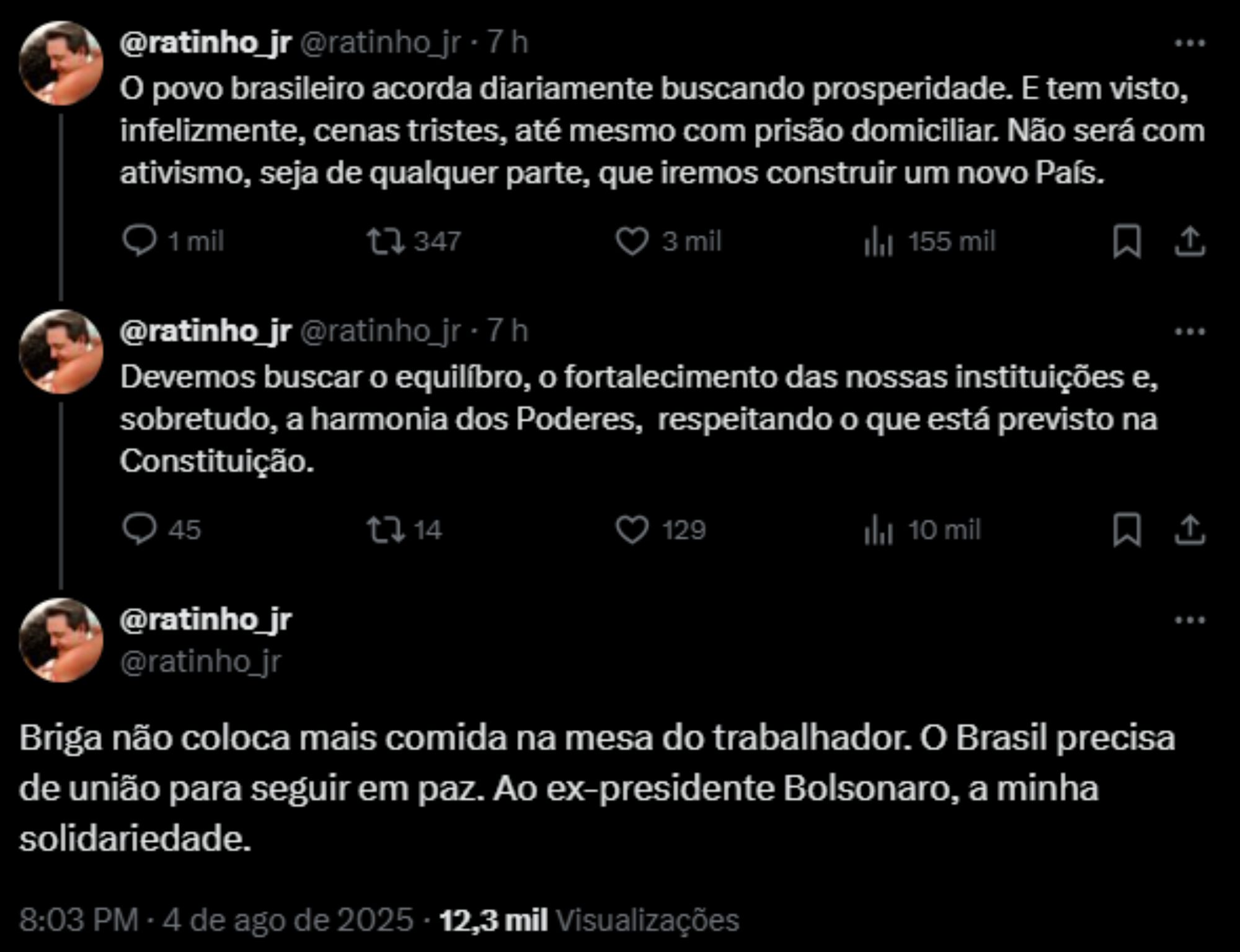 “O povo brasileiro acorda diariamente buscando prosperidade. E tem visto, infelizmente, cenas tristes, até mesmo com prisão domiciliar. Não será com ativismo, seja de qualquer parte, que iremos construir um novo País. Devemos buscar o equilíbro, o fortalecimento das nossas instituições e, sobretudo, a harmonia dos Poderes, respeitando o que está previsto na Constituição”, escreveu Ratinho nas redes sociais.